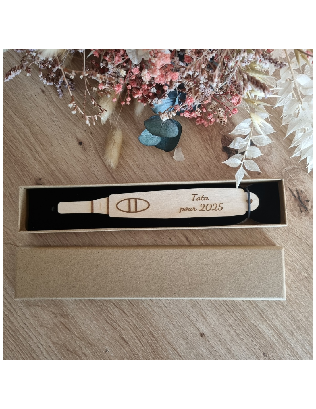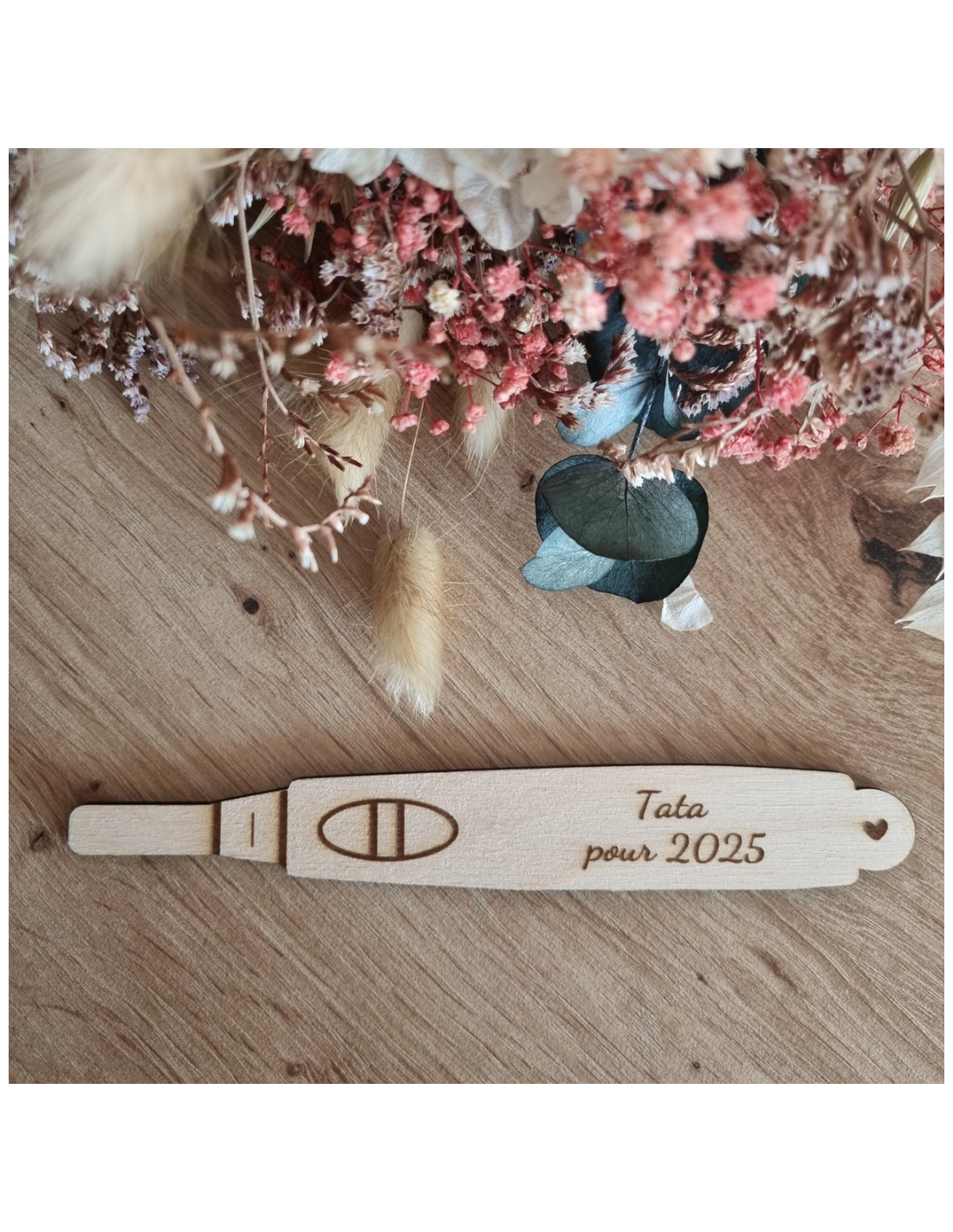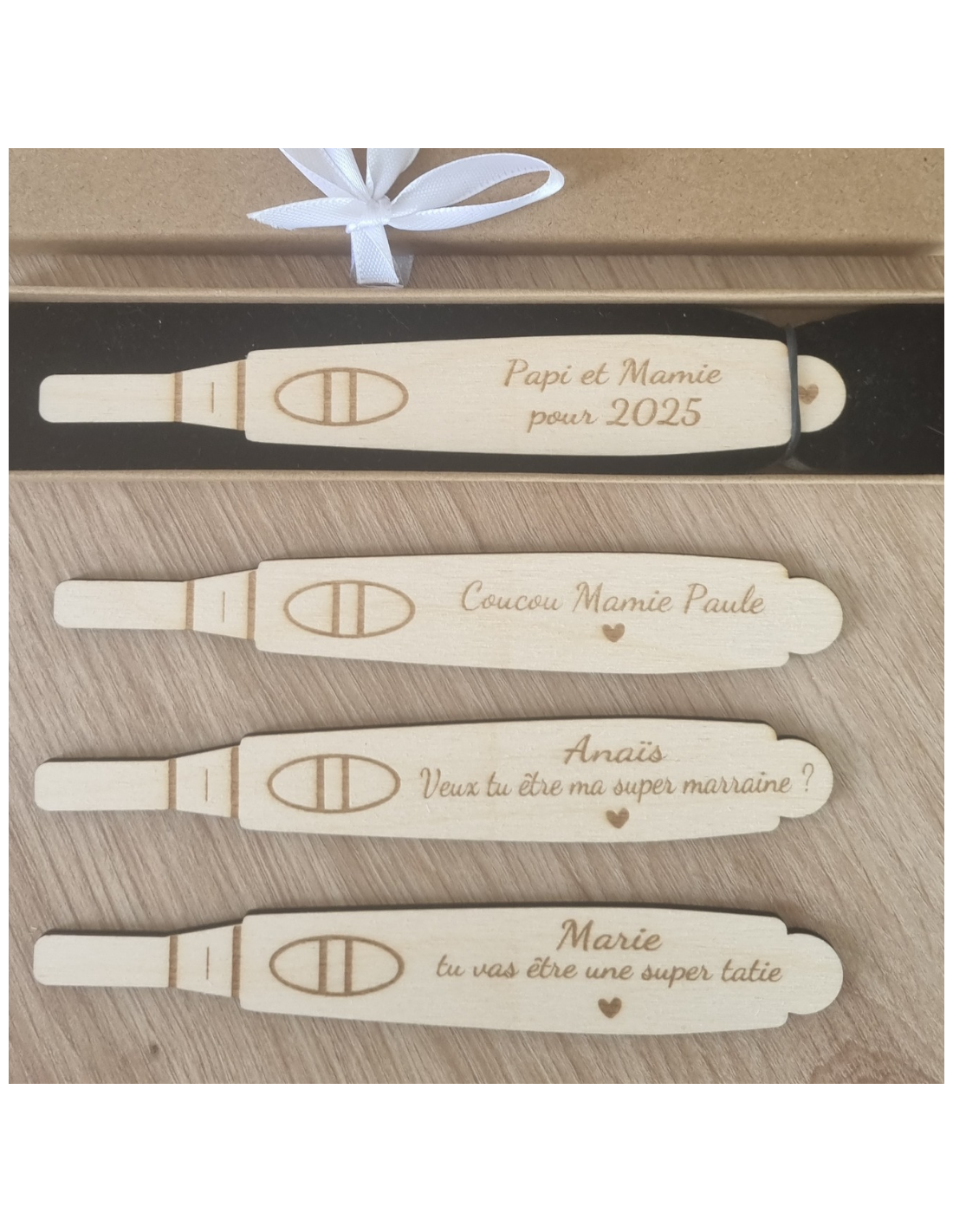 Un test de grossesse en bois gravé pour une annonce pleine d’émotion ! Personnalisable selon le destinataire : mamie, papi, papa, marraine, etc. Une surprise inoubliable 💛