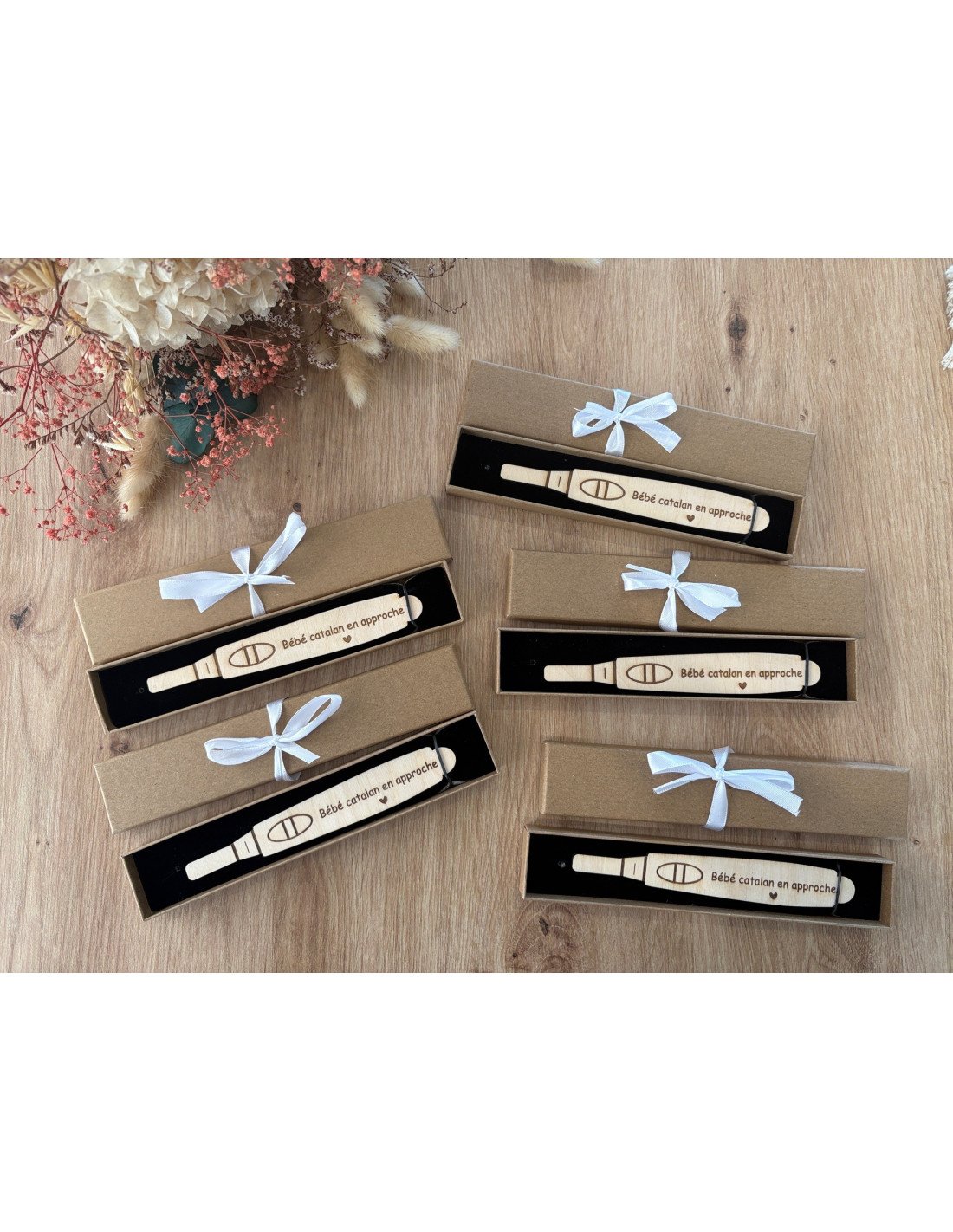 Un test de grossesse en bois gravé pour une annonce pleine d’émotion ! Personnalisable selon le destinataire : mamie, papi, papa, marraine, etc. Une surprise inoubliable 💛
