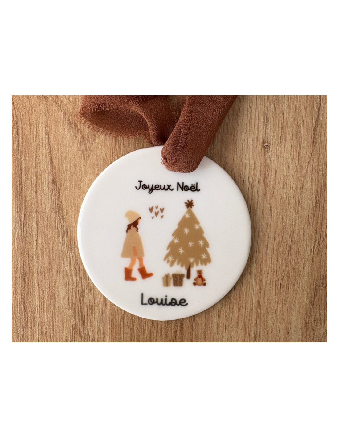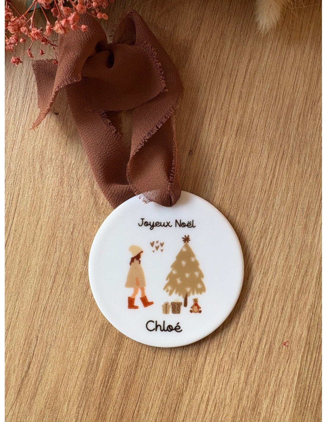 Boule de Noël en céramique blanche, personnalisée avec le prénom de votre choix ✍️ et un joli logo : 👧 petite fille, 👦 petit garçon, 🐾 … Une décoration élégante et tendre pour toute la famille 🎄.