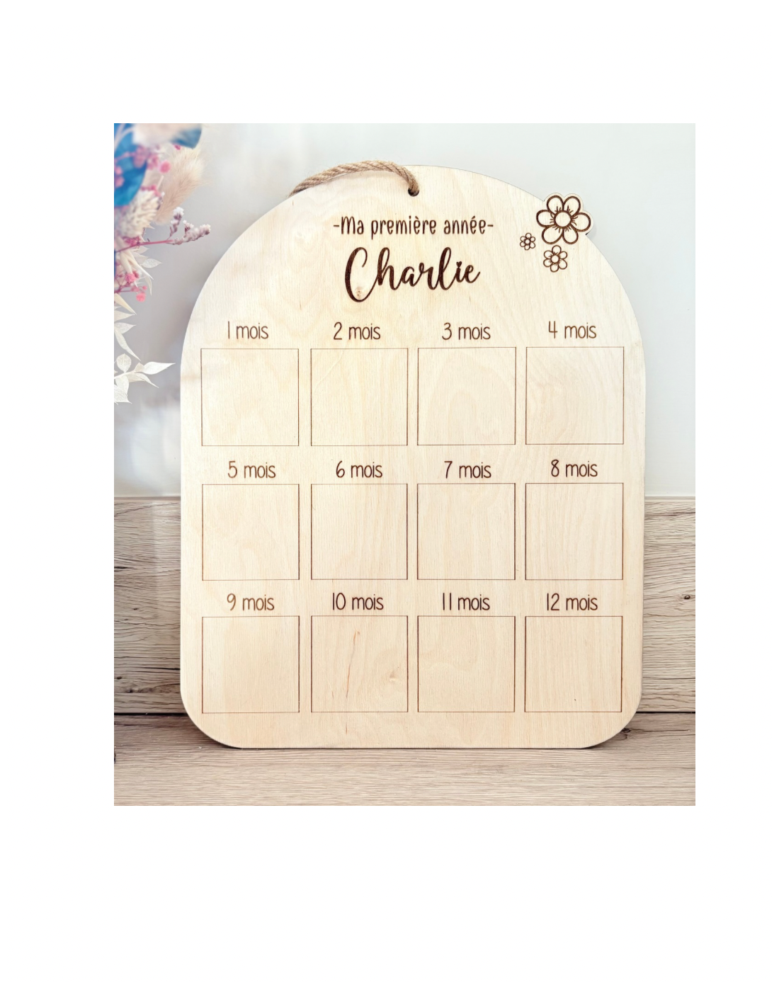 Cette magnifique plaque en bois personnalisée “Ma première année” est conçue pour afficher les 12 photos de 1 à 12 mois de votre enfant, retraçant sa toute première année avec tendresse.