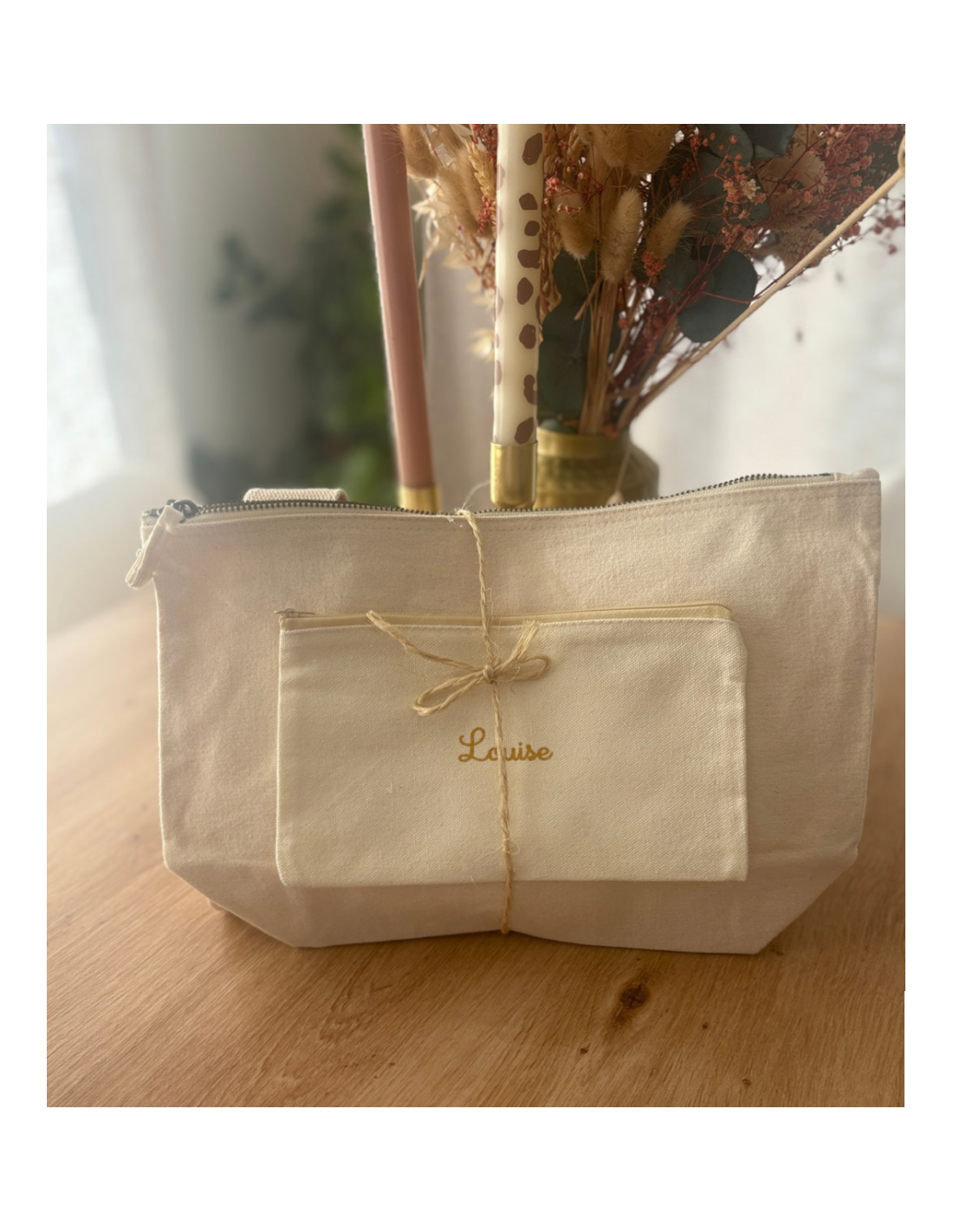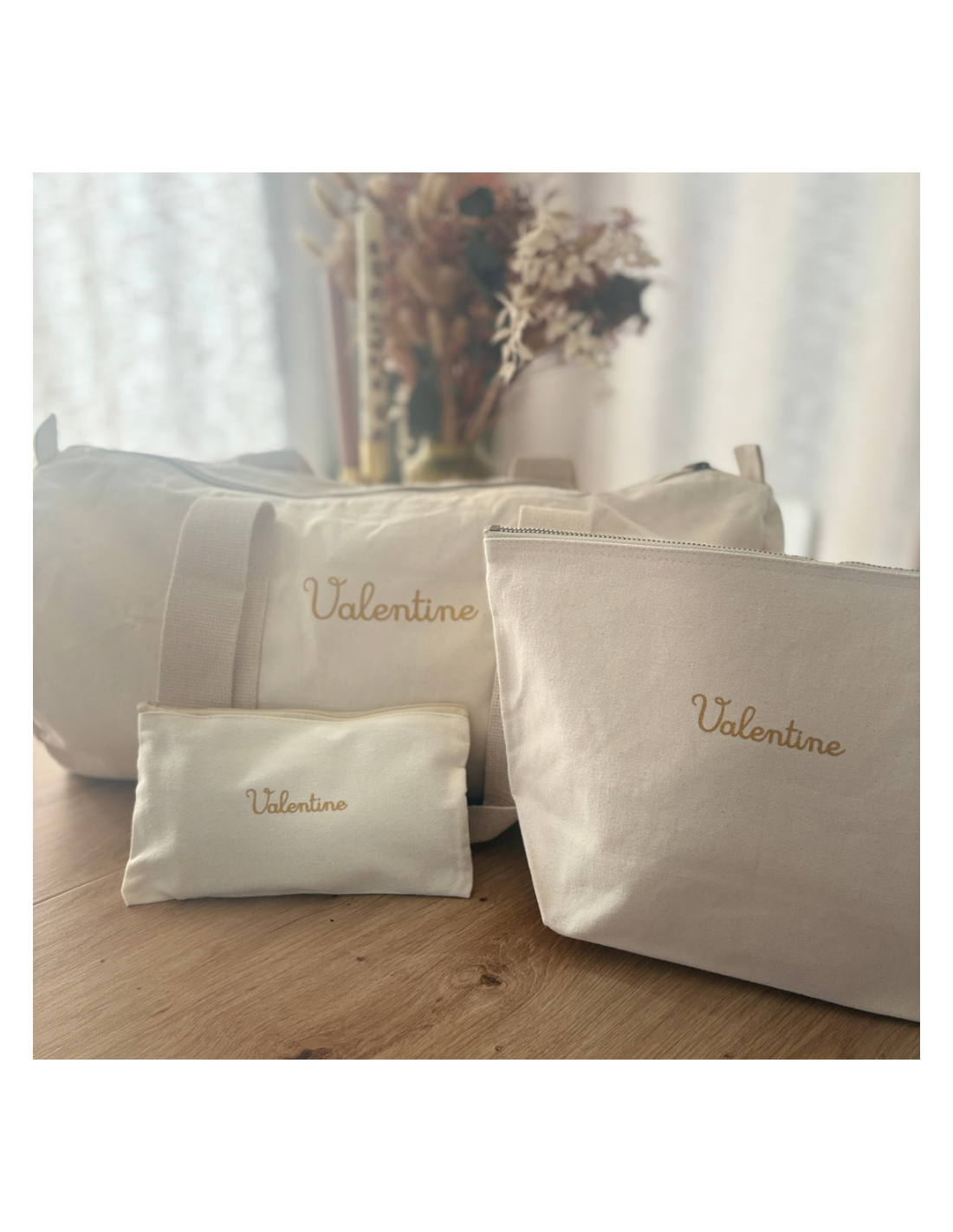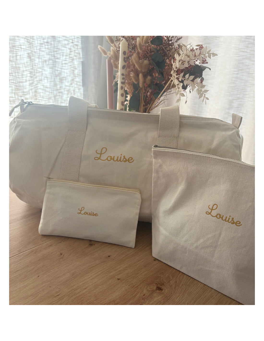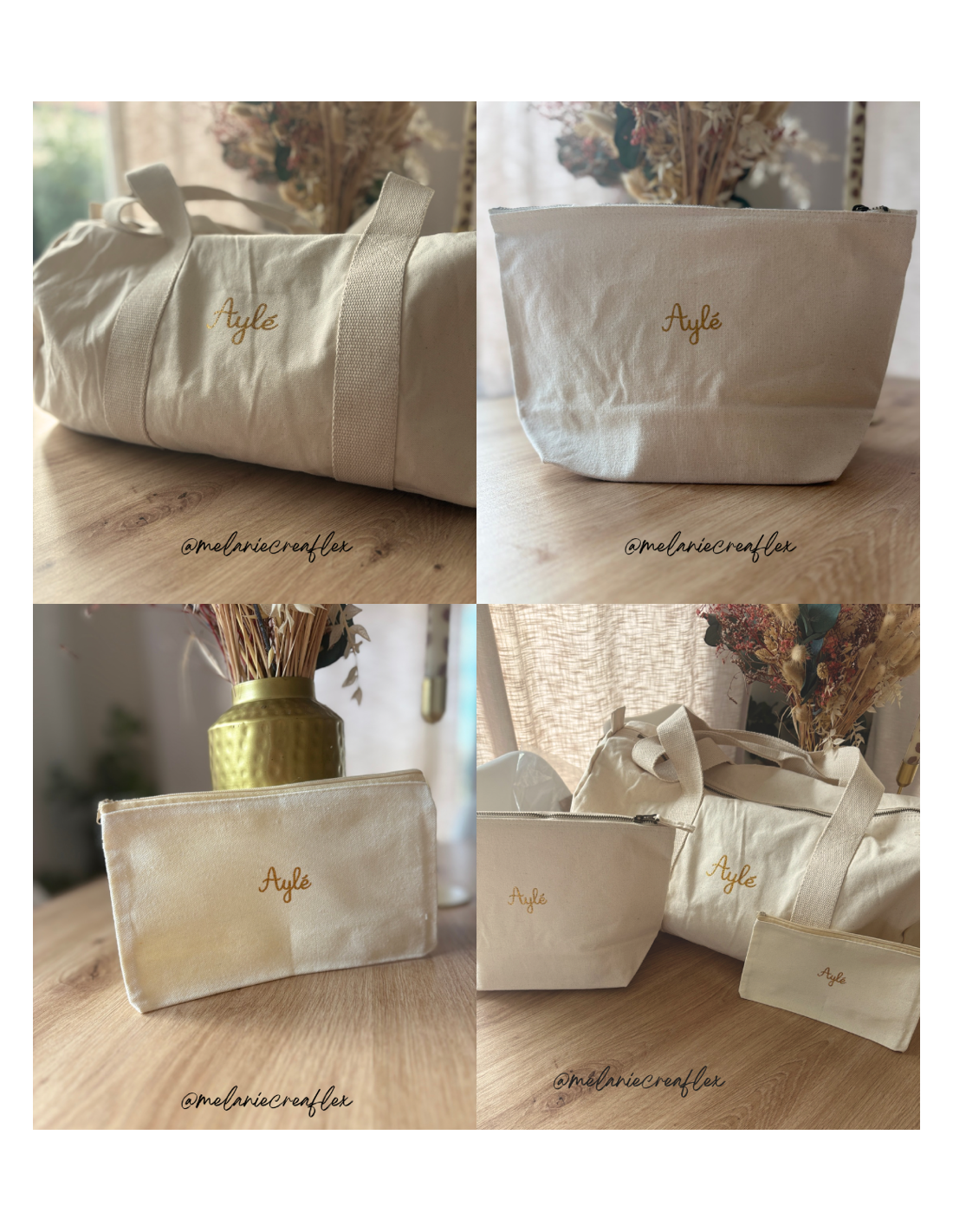 Un sac week-end , une grande pochette de 5 litres, et une petite trousse (offerte) , parfait pour tout ranger avec style. Personnalisez là avec un prénom, une phrase ou un petit mot doux !